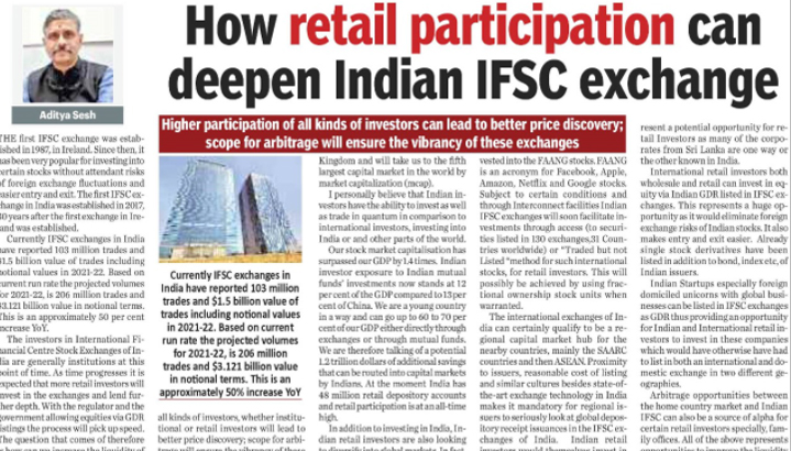 Currenlty IFSC exchanges in india have reported 103 million trades and $1.5 billion value of trades including national values in 2021-22. Based on current run rate the projected volumes for 2021-22, 206 million trades and $3.121 billion value in national terms.